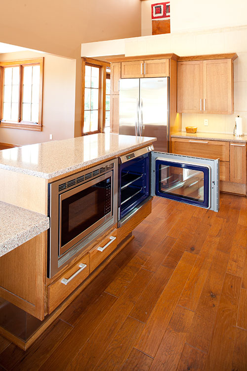 The space for the sink and cooktop should be of sufficient height and width so a wheelchair user can roll under both. Instead of installing a base cabinet in these areas, consider using wall-mounted L-brackets or other means for supporting the countertop spanning these spaces. Either leave the space open underneath or install a cabinet face frame with removable or side-retractable, self-storing doors. Don’t forget to extend the finish flooring to the rear wall under these areas so when the doors are removed or open people see that the flooring is finished.