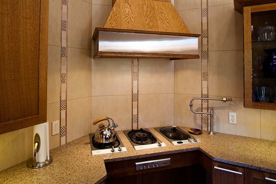 The cooktop is level with the 34-in.-high countertop and has ample knee space for Rossetti to roll underneath. The pot filler is at a convenient location above the stove.