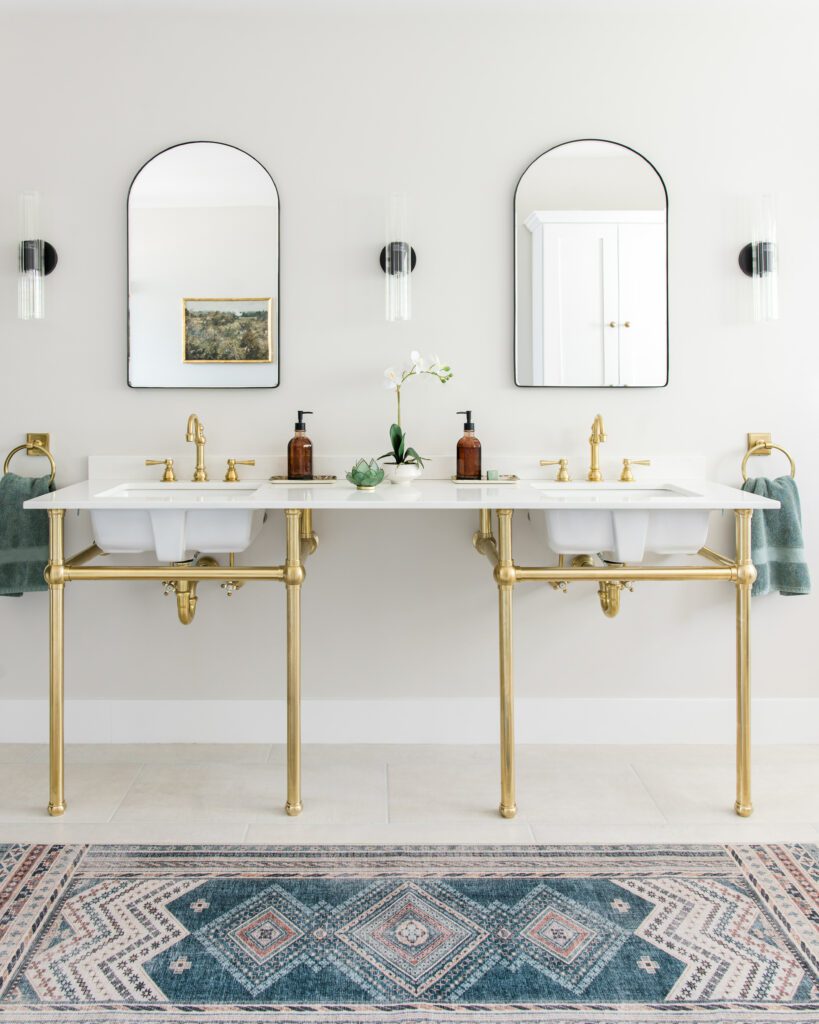 As the counters in the kitchen were destined to be replaced, she preemptively salvaged the slab from the island and repurposed it as the top of the washbasin stand. The 62-inch stone had to be cut down for its new role in the bath. The designer leveraged her relationship with her fabricator, asking him to do this fix for free, and he agreed.