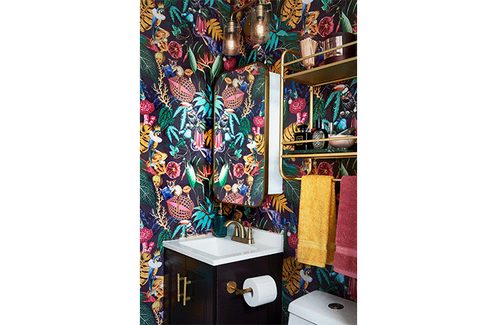 The intricate black-and-white floor tile and white subway tile in the shower were in good shape, so those were kept in place, but the designer added decorative elements like a colorful shower curtain and a cheerful, floral wallpaper that covers half the space.