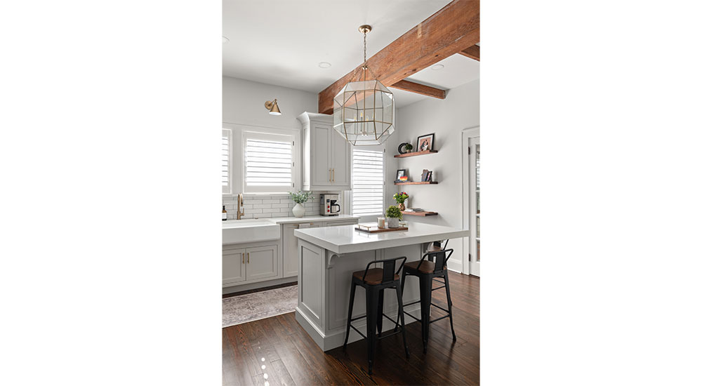 In the modest-sized, enclosed kitchen of this Dutch colonial, Hicks got creative with the size and scale of the island to leave a natural walking path. Instead of a large island, she chose a smaller footprint with a 3-in. quartz top to provide a chunky, upscale feel without taking up too much space. Although some ceiling crossbeams were removed to allow for a large range hood, the remaining rustic beams and floating shelves bring additional warmth to this light, bright kitchen.