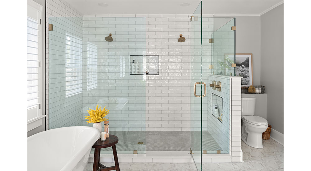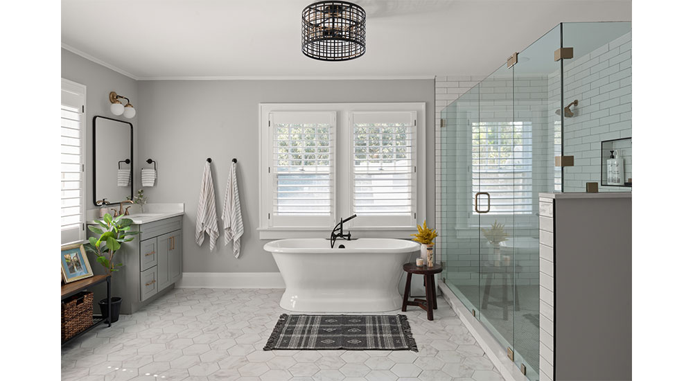 Adding a bathroom to the second floor brought plenty of challenges, but the large space accommodates the clients’ request for both a double shower and a cast-iron tub. Opposite, two individual vanities are separated by a window. When the floor tile Hicks had chosen was discontinued before the order shipped, she found this 8-in. hexagonal option. Its pattern adds interest in the large room, while keeping everything light and neutral.