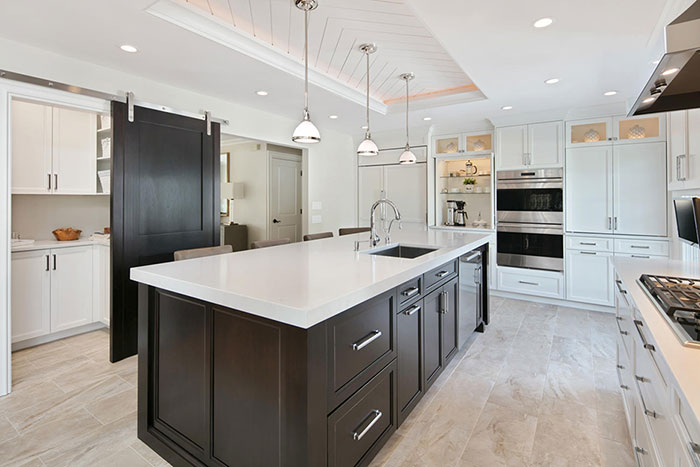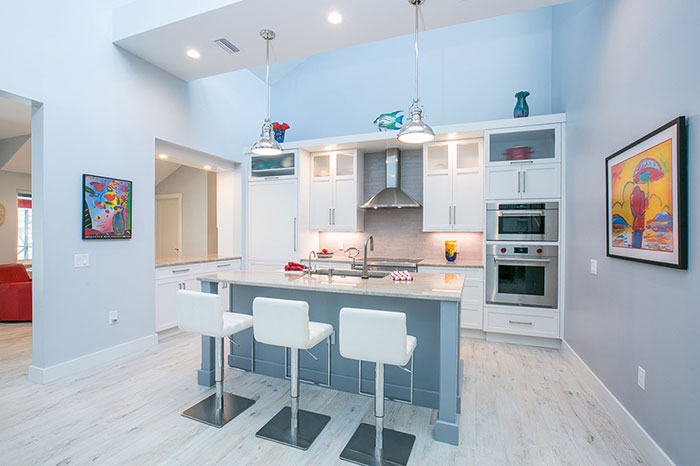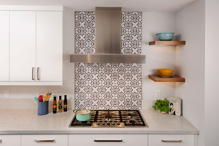 A kitchen, master bath & powder room are outfitted with a sophisticated, bold design