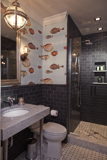 “The Art Deco-styled vanity, the neoclassic antique mirror, the rustic caged sconces and the edgy wallpaper are not things one would normally put together,” said Jenkins. “But in this case their combination works because the entire mix is totally unexpected. Interior design is an art, and sometimes art imitates life: it’s full of surprises.”