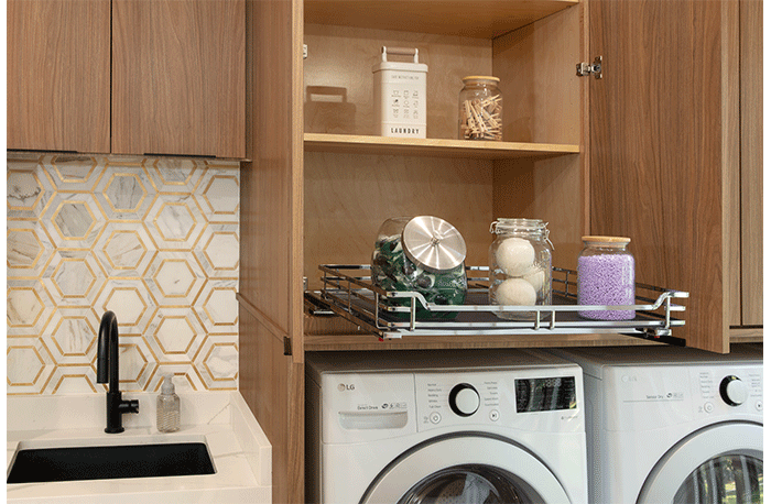 Pullout Baskets – Using pullout baskets to organize the pantry helps ensure that dry foods don’t get lost in the back of the shelf. In the laundry room, they are a great solution for organizing detergents and other supplies.