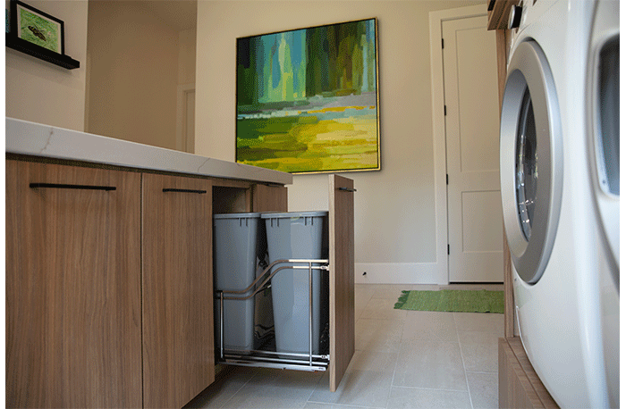 Trashcan Pullout – Commonly mounted near the sink in the kitchen, a trashcan pullout in the laundry room is an ideal way to keep discarded items out of sight. It also eliminates the need to have a trashcan taking up floor space, an important consideration when space is limited.