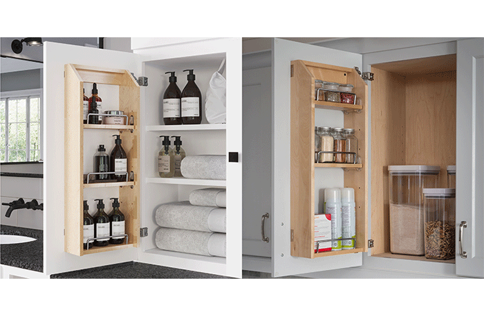 Door-Mounted Storage Racks – Add functionality to a kitchen or bath space by utilizing the cabinet doors for storage space. These door-mounted racks are perfect for organizing items that need to be within easy reach.