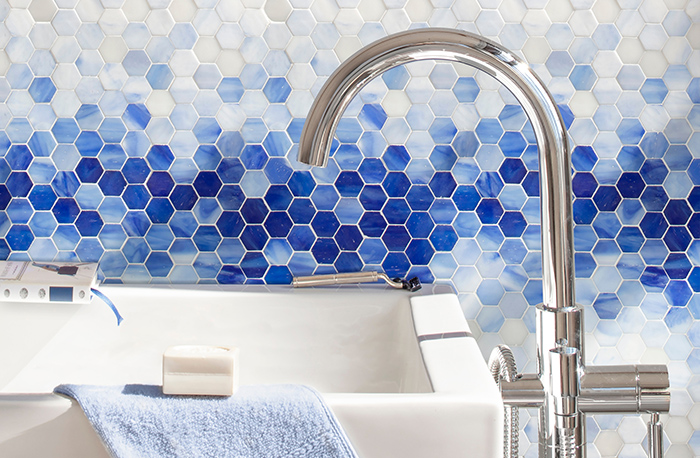 Products December 19Hex Mist is a water-jet mosaic in lapis lazuli, iolite, covellite, moonstone and opal sea glass.