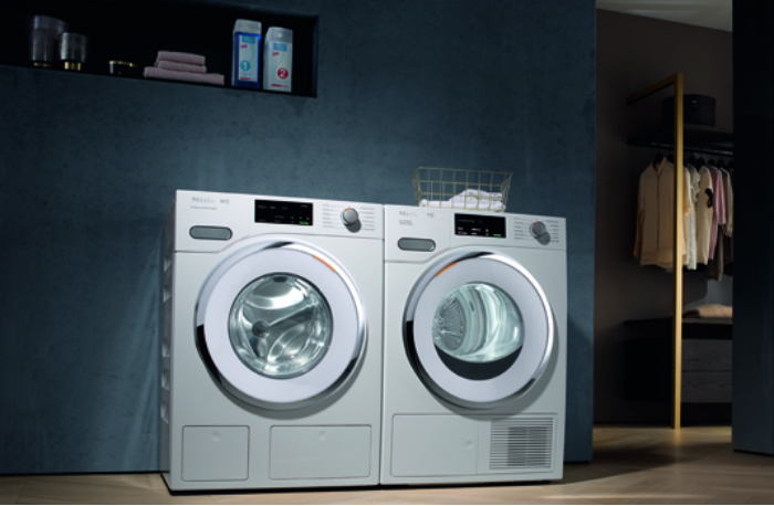 The W1 washing machine and T1 dryer are linked to Miele's mobile app for monitoring and cartridge replacement.