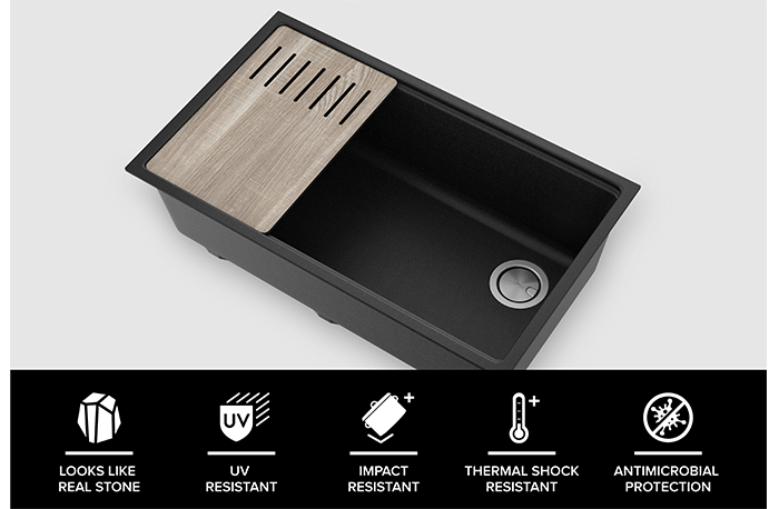 Bellucci is constructed from a durable granite blend with a range of naturally wear-resistant properties. This material offers unparalleled resistance to impact and thermal shock, with heat resistance up to 500°F. An advanced molding process creates an ultra-smooth, hydro-repellent surface which causes water to bead up and roll off so that the sink stays dry after every use. Engineered with an optimal angle that promotes complete drainage and gently rounded corners, these sinks are incredibly easy to clean and maintain.