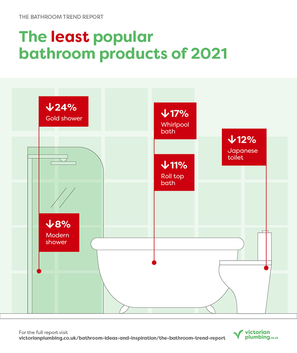Perfect for people with reduced mobility, walk-in baths remove any risks involved with stepping onto wet surfaces, allowing for an even more relaxing experience. Freestanding tubs in the 2021 bathroom remain as popular as ever though, and if you’ve got the space, they can act as a real centerpiece. Even though they might have seen a slight 6% dip last year, they still amassed more than half a million searches.