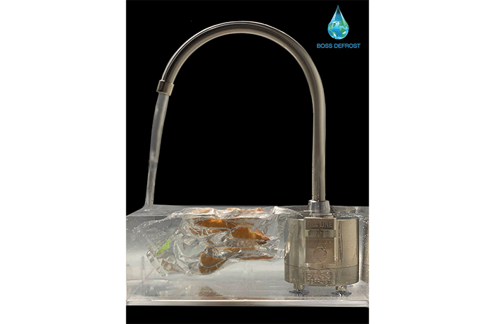 The Boss Defrost mimics the USDA’s recommended running-water method of thawing (called “slacking”) while reducing water use by 98.5%. Approximately one hour of slacking is needed to thaw a pound of food, and in that time, up to 100 gallons of water go down the drain. Boss Defrost uses water agitation and a high flow rate to effectively defrost food and a recirculating pump to conserve water. Photo credit: Boss Defrost